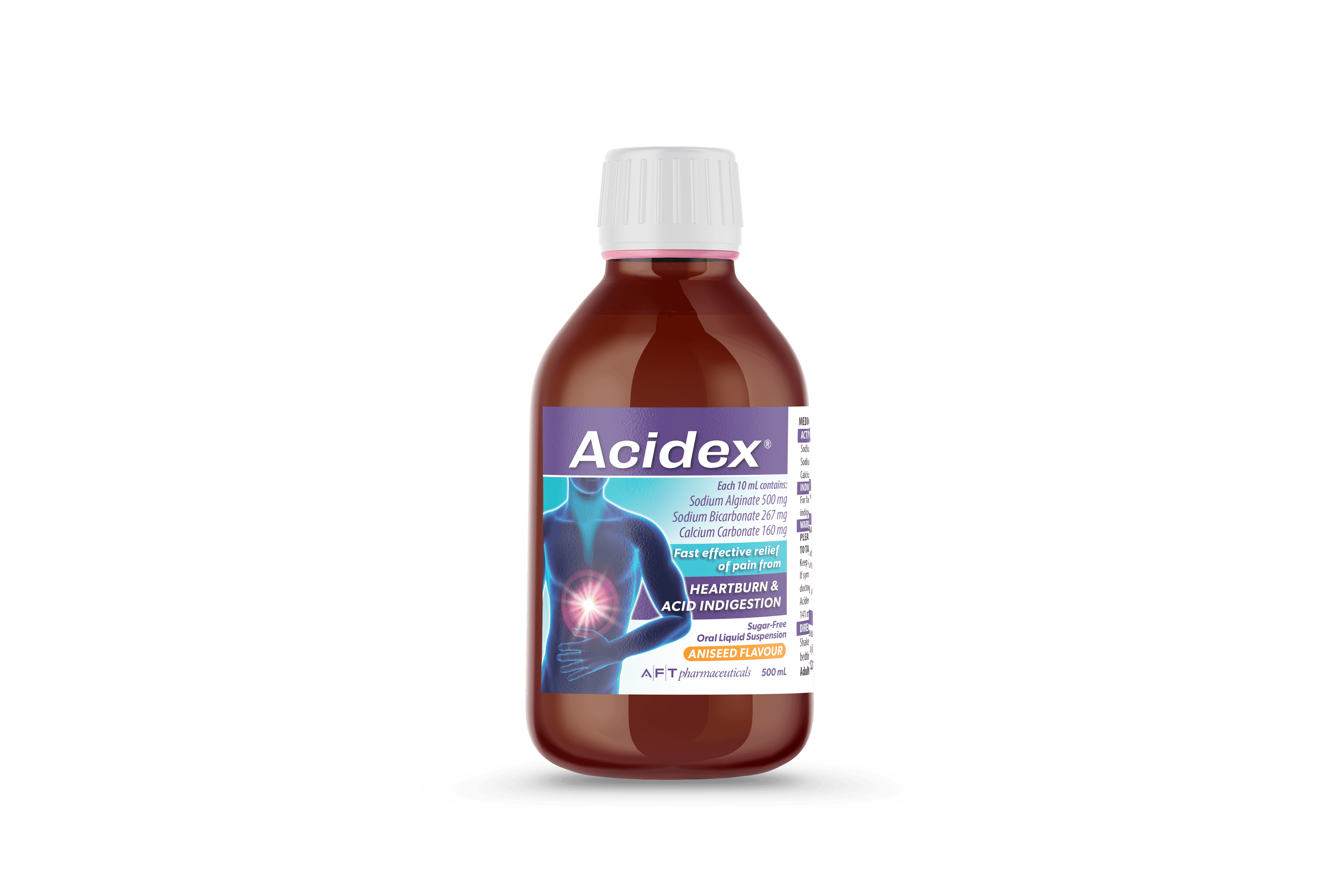 Acidex contains 3 active ingredients, these ingredients neutralise stomach acid (sodium bicarbonate and calcium carbonate) while preventing acid from flowing back into the oesophagus (sodium alginate). This combination works both to reduce the likelihood of acid irritation and reflux, offering relief from the pain of heartburn and acid indigestion.